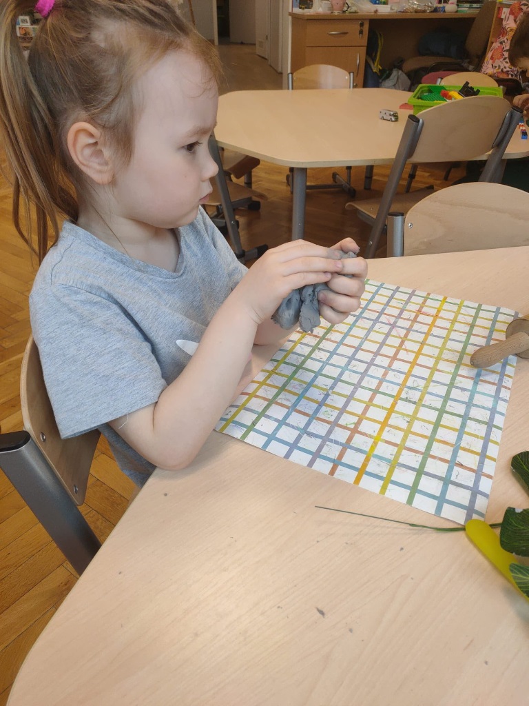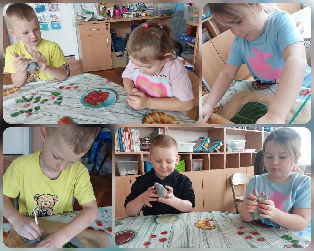 Przedszkolaki wykonały miseczki w kształcie liścia monstery z gliny. Zadanie było kilku etapowe trzeba było rozgnieść i